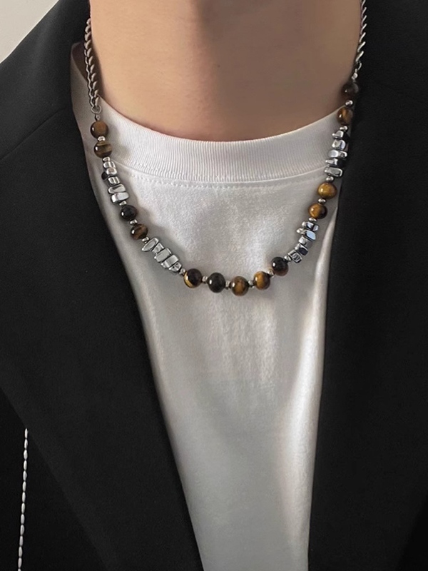 Men’s Tiger Eye Stone Irregular Silver Bead Necklace