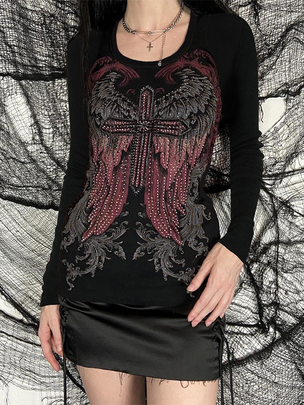 Wing Cross Rhinestone Print Long Sleeve Tee