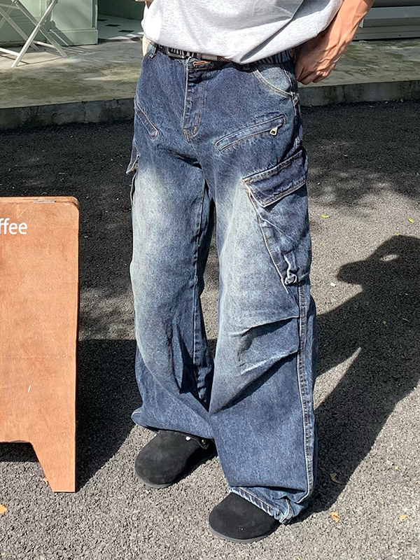 Men’s Washed Distressed Side Big Pocket Cargo Jeans