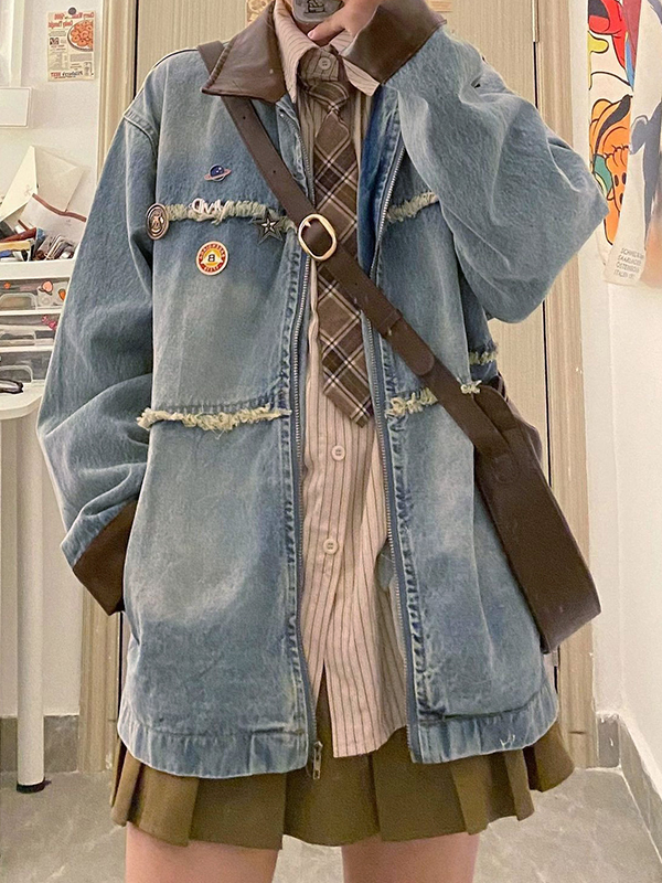 Vintage Contrast Splice Raw Trim Zip Up Denim Jacket