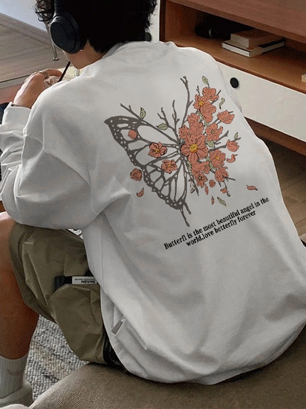 Men’s Letter Butterfly Print Crew Neck Long Sleeve Tee