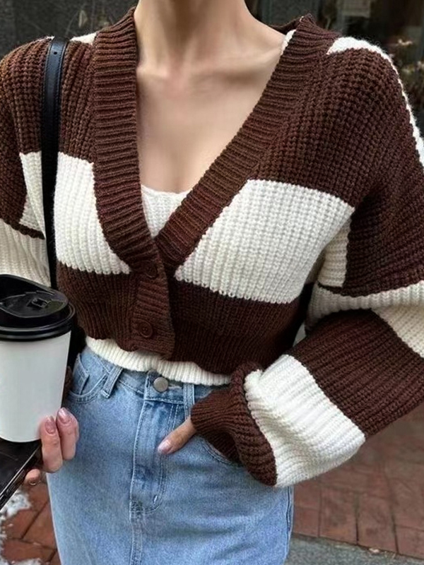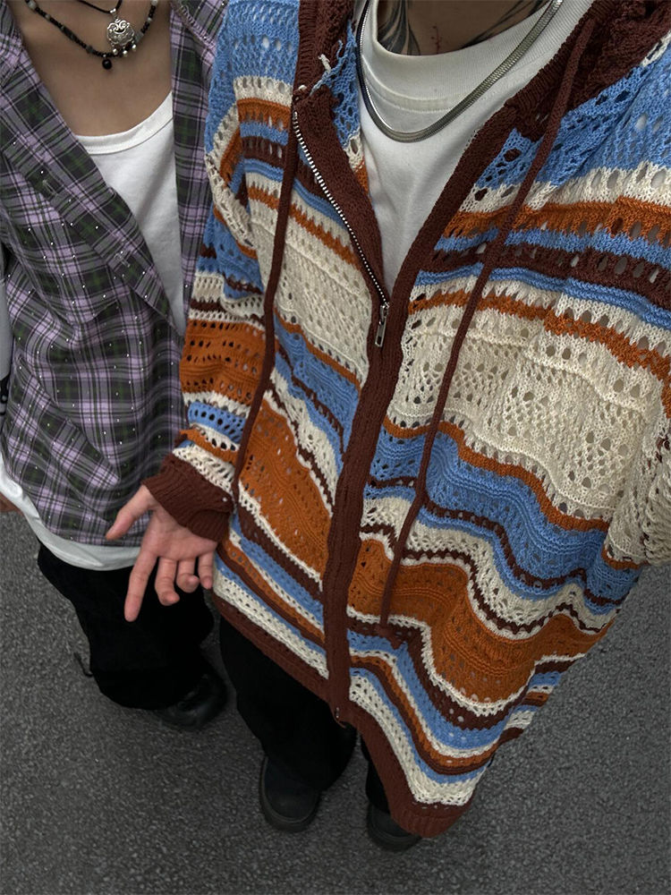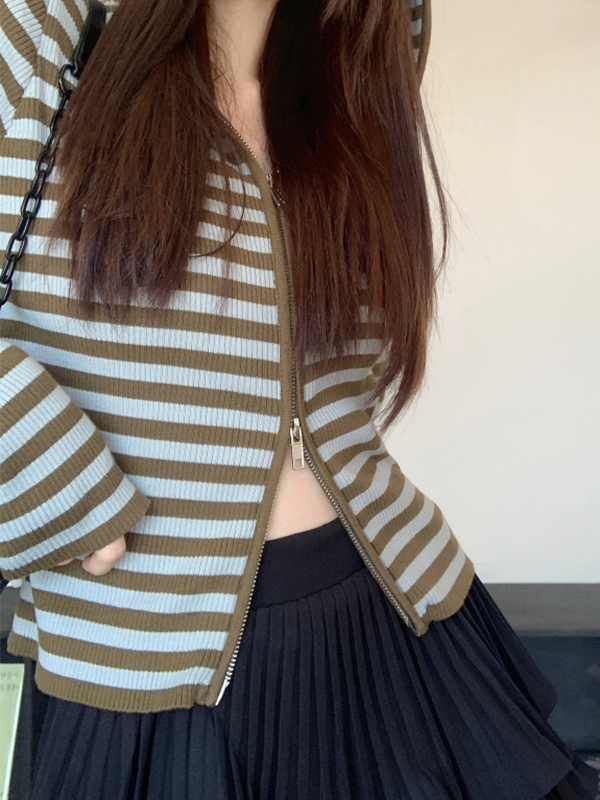 Contrast Color Striped Hooded Double Zip Knit Cardigan