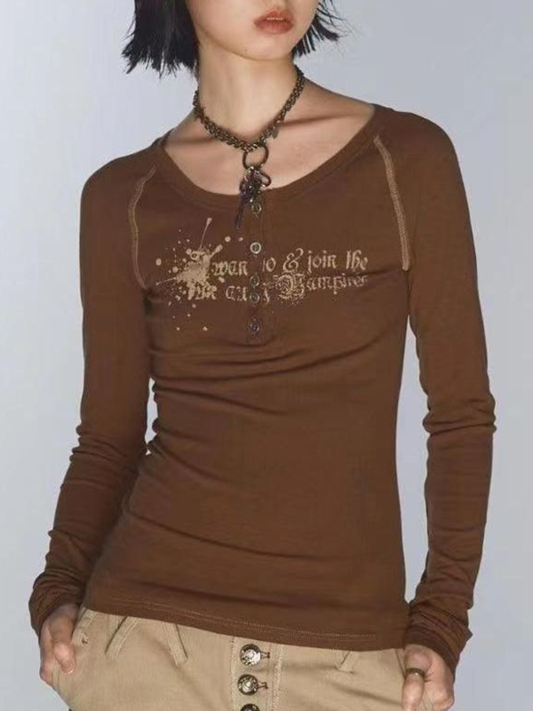 Vintage Print V Neck Breasted Long Sleeve Tee
