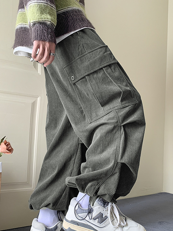 Men’s Corduroy Big Pocket Bound Feet Drawstring Cargo Pants